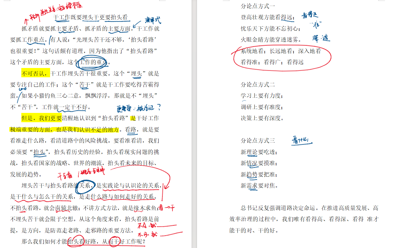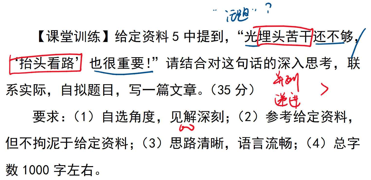 观点句呈现“递进”关系,即真正的前进既需要持续奔跑,更需要明确目标,与这道题,“干工作既要埋头苦干更要抬头看路”观点相似度很高。考场上只要把这题海班道题的思路稍作调整就可作为咱们考场作文了。